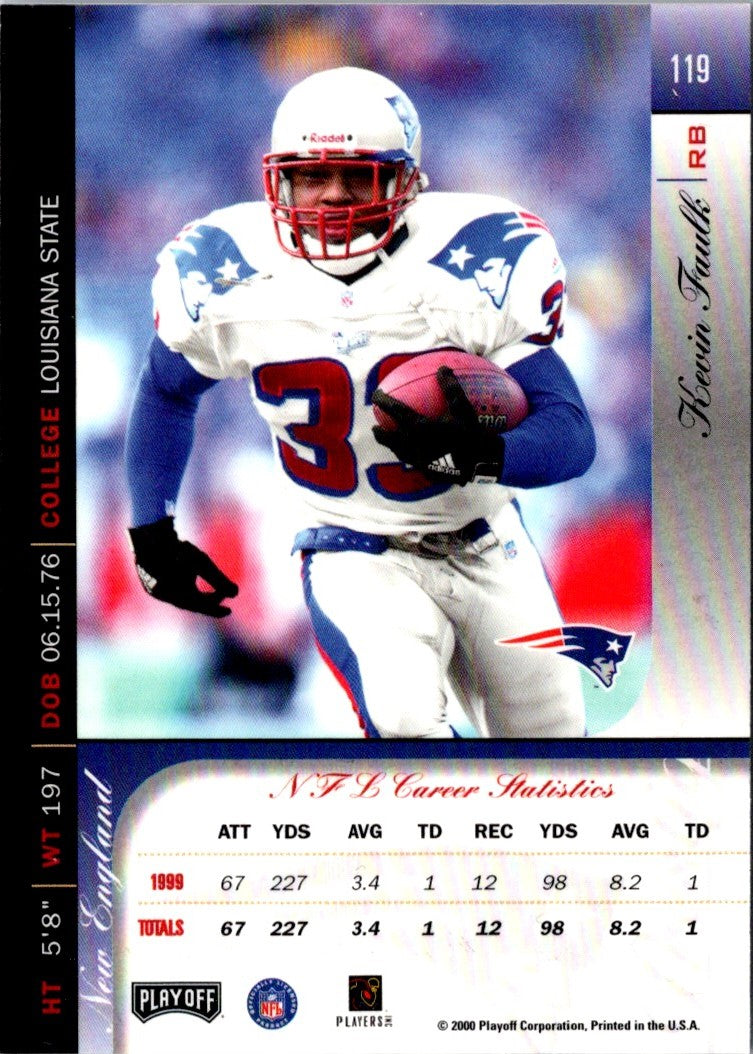 This 2000 Playoff Prestige Kevin Faulk #119New England Patriot card is the perfect addition to any sports card collection. Featuring a high-quality image of the All-Pro running back in his Patriots uniform, the card captures Faulk's signature playmaking style, with his #39 clearly visible. The card also features a silver foil stamp, adding a touch of class and sophistication to the piece. With its classic design and professional-level quality, this card is a must-have for any Patriots fan or sports card collector. Add this card to your collection today and own a piece of sports history!