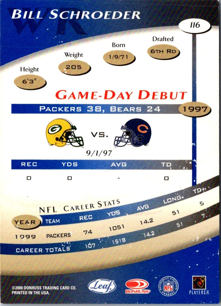 This 2000 Quantum Leaf Bill Schroeder #116 Green Bay Packers card is a must-have for any collector! This card features an amazing photograph of Bill Schroeder in a Green Bay Packers uniform, as well as detailed statistics and records from his professional career. This card is sure to be a great addition to any collection, and it is sure to be a conversation starter. This card is the perfect way to pay tribute to one of the most notable members of the Green Bay Packers. Add it to your collection today!