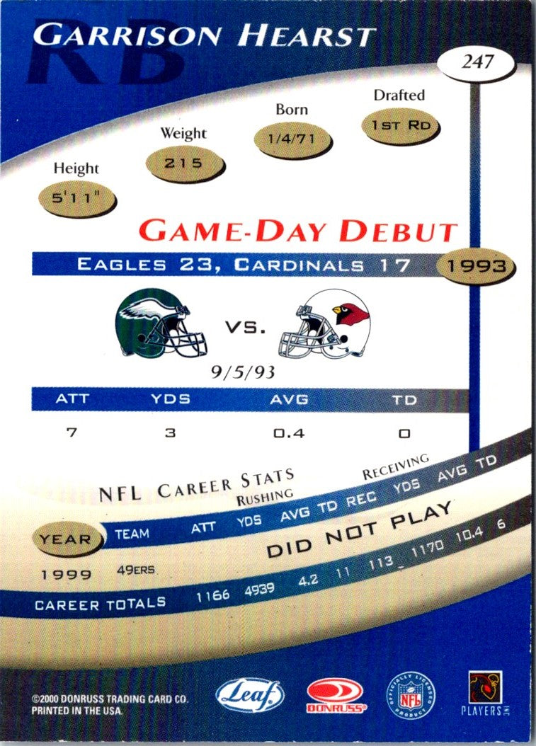 This 2000 Quantum Leaf Garrison Hearst #247 San Francisco 49ers card is a must-have for any Niners fan! Featuring a glossy finish and crisp detailing, this card is sure to be a standout in any collection. With Hearst depicted in his signature Niners uniform, this card evokes the energy of the team and the nostalgia of a golden era of football. Add this card to your collection and show your Niners pride!