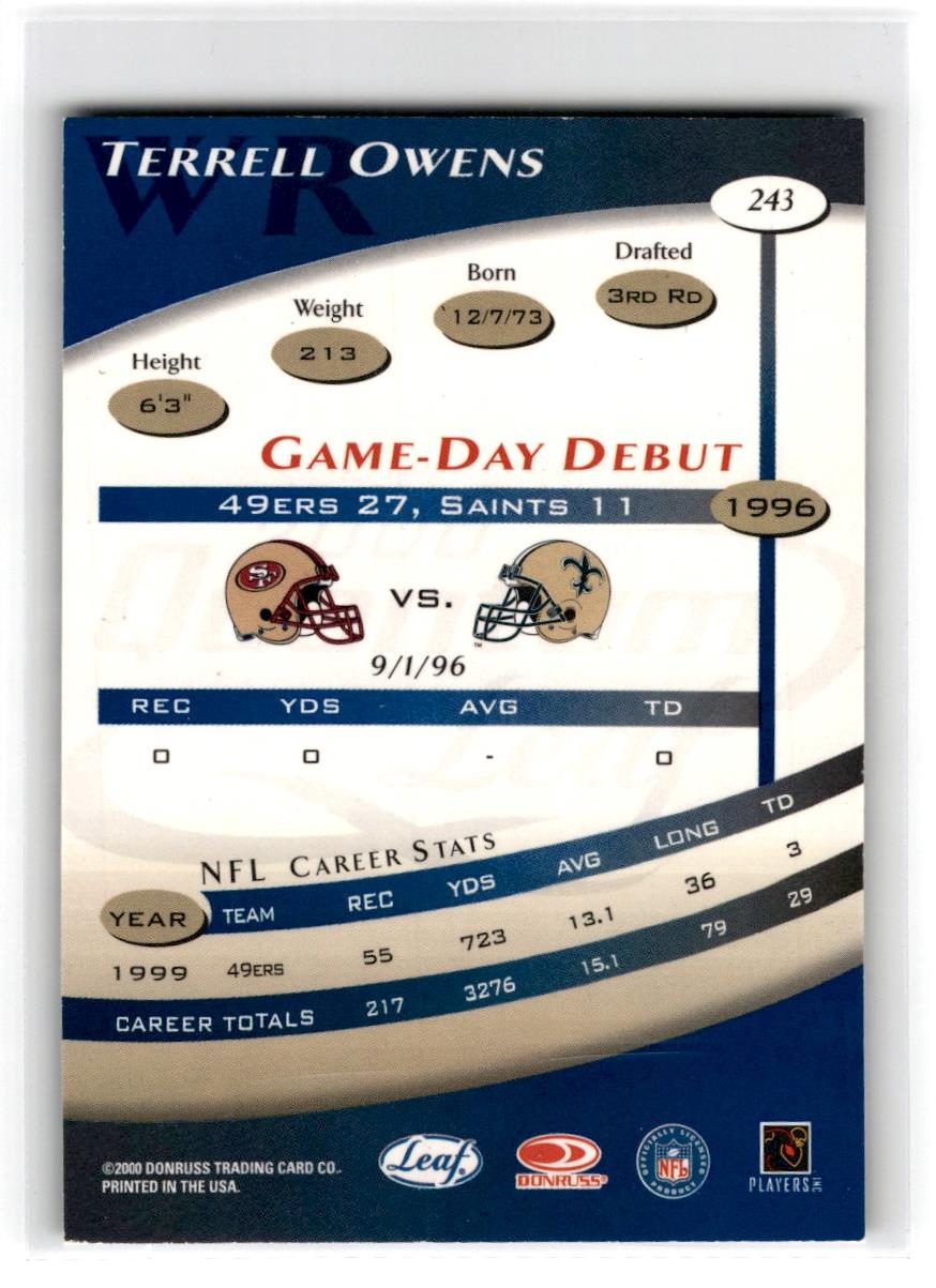 This 2000 Quantum Leaf Terrell Owens #243 San Francisco 49ers card features a unique and colorful design, with a picture of Owens in action on the front and his stats and team information on the back. Owens was a star wide receiver for the Niners during this period and one of the most electrifying players in the NFL. This card is a great addition to any collection, and it commemorates one of the greatest players to ever run the gridiron. Don't miss out on the chance to own an amazing piece of NFL memorabilia.
