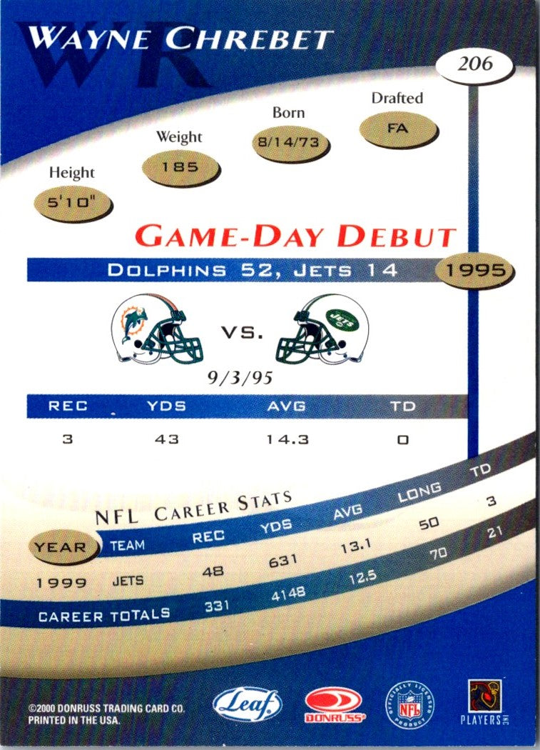 This 2000 Quantum Leaf Wayne Chrebet #206 New York Jets card is the perfect addition to any Jets fan's collection. Featuring a crisp, glossy image of Chrebet in full uniform, this card will be a great conversation starter. It's a must-have for any fan looking to add to their collection of Jets memorabilia. With a history of success and a dedicated fan base, owning this card is an easy way to show your support for the New York Jets. Show your pride and add this card to your collection today.
