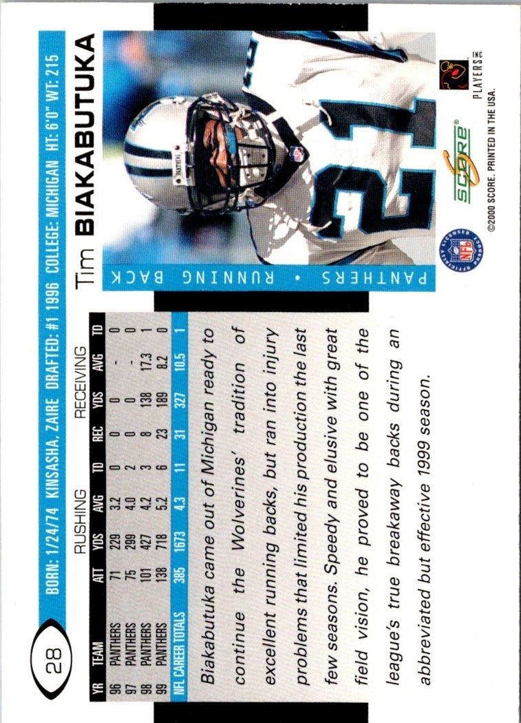 This 2000 Score Tim Biakabutuka #28 Carolina Panthers card is the perfect way to commemorate a memorable season for this popular Panthers running back. The card features a crisp and vibrant full-color photograph of Biakabutuka on the field in his Panthers uniform. The reverse side of the card includes Biakabutuka's vital statistics and career highlights. This card captures Biakabutuka's essence on the field and makes a great addition to any football fan's collection.