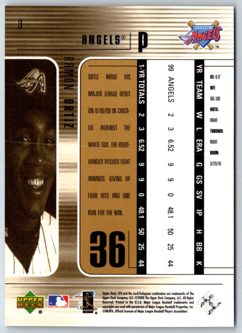 This 2000 SPx Ramon Ortiz #3 Anaheim Angels card is a must-have for any serious collector of baseball cards. Featuring a dazzling full-color photo of Ortiz in action, this card is the perfect way to commemorate the Angels' 2000 season. The card is produced on high-quality card stock and features the MLB logo and Ortiz' player info on the back. With vibrant colors and a glossy finish, this card is sure to stand out in any collection. Add this 2000 SPx Ramon Ortiz #3 Anaheim Angels card to your collection today!