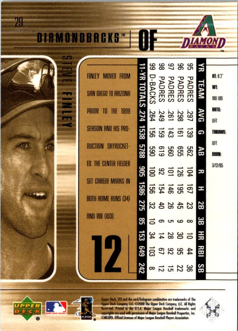 Steve Finley #29 Arizona Diamondbacks is a must-have item for any baseball enthusiast's collection. This 2000 SPx card features an action shot of Finley in his Diamondbacks uniform as he swings for a hit. With sharp colors and bold lettering, this card is sure to make a statement in any fan's collection. Finley was a three-time All-Star and a two-time Gold Glove Award winner during his 18-year career. This card is a great way to honor the legacy of one of the greatest players to ever wear the Diamondbacks uniform. Add this card to your collection today and show your admiration for one of baseball's greatest players.