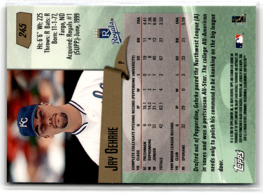 This 2000 Stadium Club Chrome Jay Gehrke #245 card is a must-have for any Kansas City Royals fan. Featuring a glossy chrome finish and vibrant colors, this card is sure to stand out in any collection. It features an action shot of Jay Gehrke in his Royals uniform, as well as his name and team logo. It's the perfect way to show your support for the Royals and celebrate the career of one of their most beloved players. Add this card to your collection today and show off your Royals pride!
