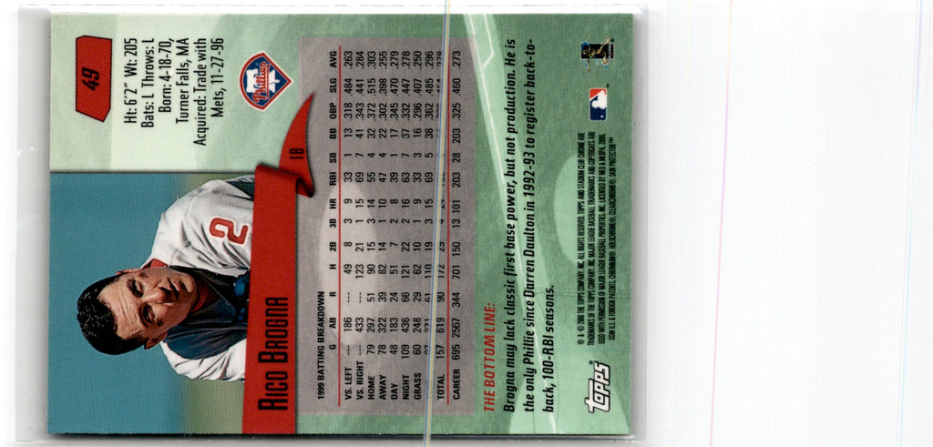 This 2000 Stadium Club Chrome Rico Brogna #49 Philadelphia Phillies card is a must-have for any serious collector. Its chrome technology provides a superior look and feel. The card features a full color photo of Brogna in his Phillies uniform, ready for action. With its vibrant colors and detailed design, this card will make an excellent addition to any collection. Get your hands on this fantastic card today and show off your Phillies pride!