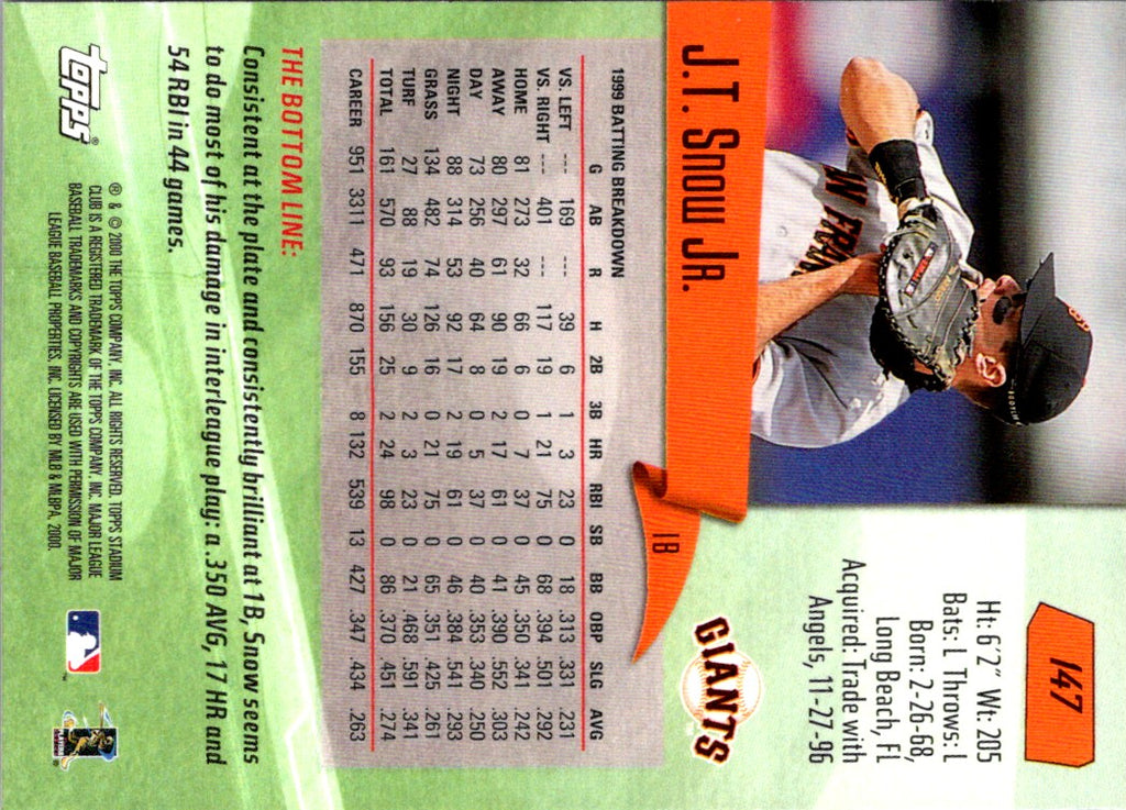 This is your chance to own a piece of baseball history! The 2000 Stadium Club J.T. Snow #147 San Francisco Giants card is a must-have for all Giants fans and card collectors. Featuring a dynamic action shot of J.T. Snow, this card is a perfect addition to any collection. The card is in excellent condition, with no signs of fading, wear, or damage. It's a great way to show your Giants pride, and a perfect way to commemorate the great career of J.T. Snow. Get your hands on this piece of baseball memorabilia today!
