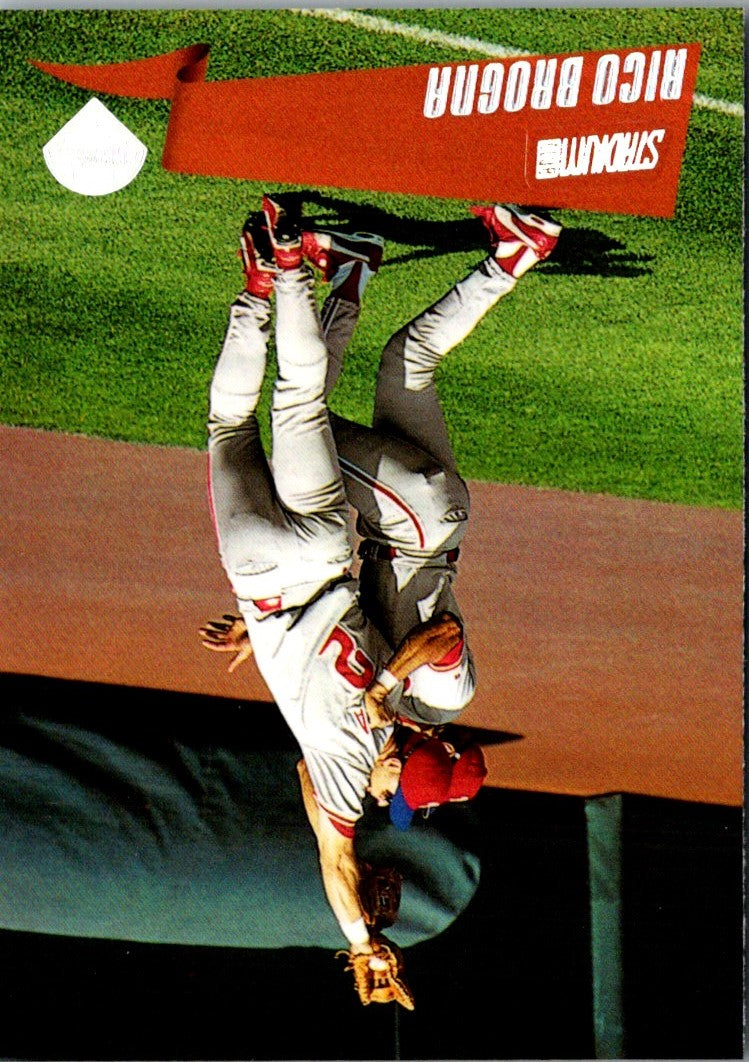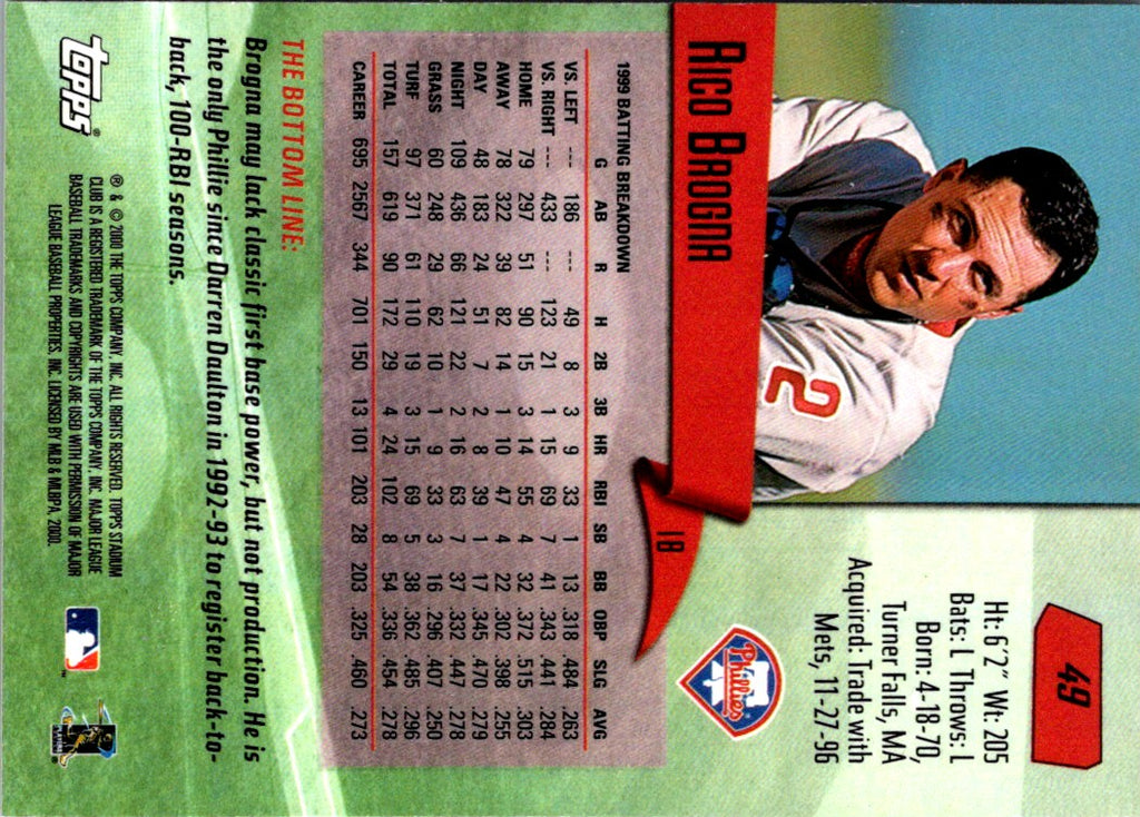 This 2000 Stadium Club Rico Brogna #49 Philadelphia Phillies card is a must-have for any Phillies fan! The card features a classic image of Brogna, a former eight-year All-Star, in action in his Phillies uniform. Featuring a glossy finish and crisp artwork, this card is a great way to show your team loyalty. Add this card to your collection today and you'll be sure to impress any Phillies fan.