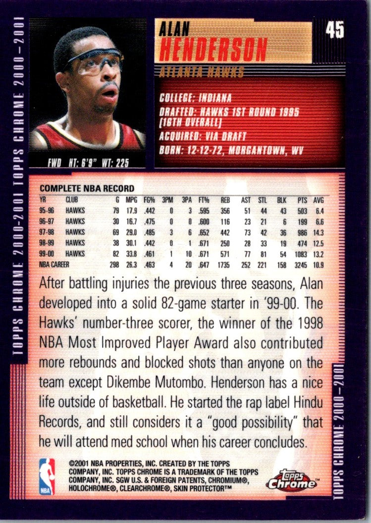 This 2000 Topps Chrome Alan Henderson #45 card is a must-have for any Atlanta Hawks fan. It captures the Hall of Famer in all his glory, with a sharp and vibrant image of Henderson in full flight. This card is in beautiful condition, and would make an excellent addition to any collection. The back of the card is packed with stats and accomplishments, making it a great conversation piece. Get your hands on this 2000 Topps Chrome Alan Henderson #45 card today, and add a touch of nostalgia to your collection!