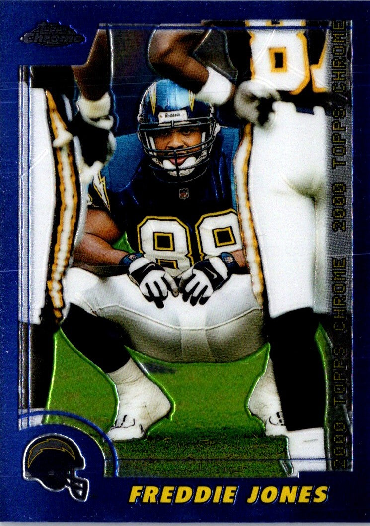 This 2000 Topps Chrome Freddie Jones #19 card from the San Diego Chargers is the perfect addition to any football card collection. Featuring a glossy chrome finish, this card is sure to make an impression. The detailed image of Jones shows him in action on the field, ready to take his team to victory. With its vibrant colors and sharp design, this card captures the excitement of the game. Add this unique card to your collection today and show off your San Diego Chargers pride!