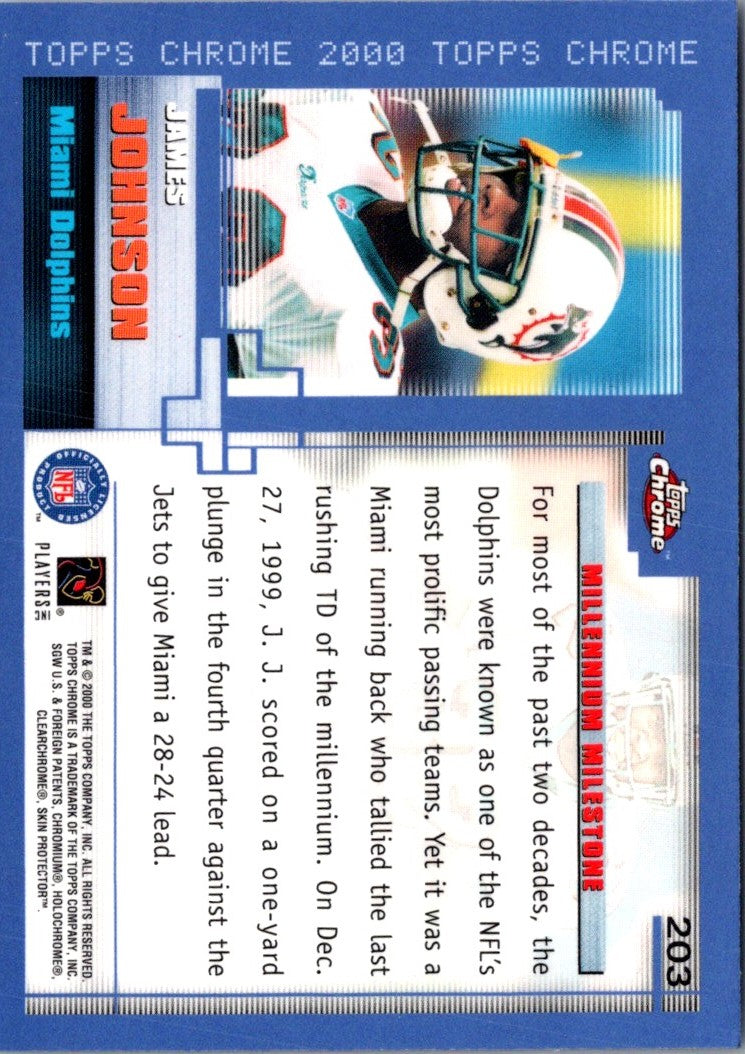 This 2000 Topps Chrome James Johnson #203 is the perfect addition to any Miami Dolphins fan's collection. Show your allegiance with this classic card featuring James Johnson in his Dolphins uniform. The card is printed on glossy chrome stock for a high-quality look and feel. Impress your friends with this amazing card and add it to your collection today!