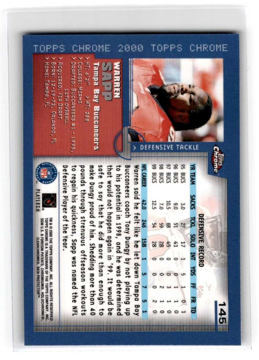 This 2000 Topps Chrome Warren Sapp #145Tampa Bay Buccaneers card is in pristine condition. The ultra-clear design and metallic finish of Topps Chrome make it a must have for any Buccaneers fan. Sapp, the legendary defensive tackle, was named to the 1990s All-Decade Team and was an integral part of the Buccaneers' 2002 Super Bowl run. This card truly captures the electricity and athleticism of one of the most feared defensive players of all time. Add this card to your collection today and display your Bucs pride!