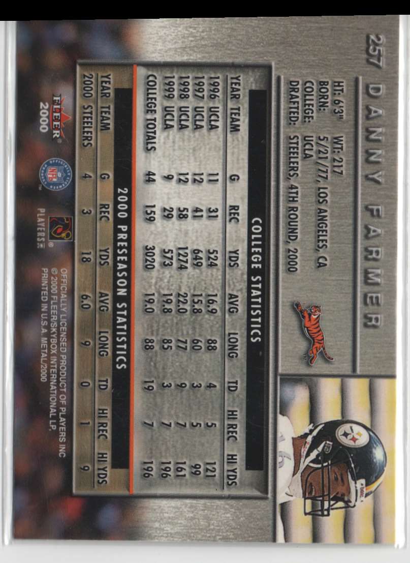 This 2000 Topps Danny Farmer #394 card from the Pittsburgh Steelers is a great addition to any collection. Featuring a full-color portrait of Danny Farmer in his Steelers uniform, this card is sure to capture the eye of any fan. The back of the card features a detailed bio and stats, making this card a great way to commemorate the Steelers' 2000 season. Don't miss your chance to own this piece of Steelers history today!