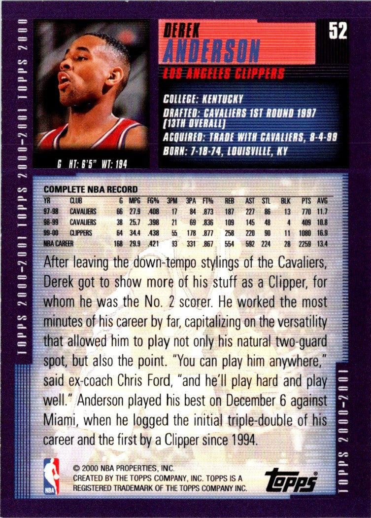 The 2000 Topps Derek Anderson #52 Los Angeles Clippers card captures the excitement of the NBA! Featuring a high-quality full-color image of Anderson in action, this card is perfect for any basketball fan or card collector. It boasts sharp corners and edges, as well as vibrant colors. Grab this card to complete your collection and to honor one of the NBA's most beloved players!