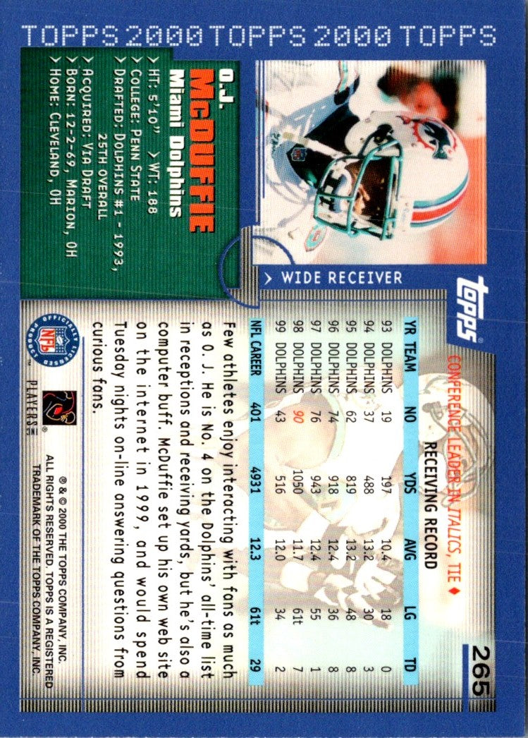 This 2000 Topps O.J. McDuffie #265 card is a must-have for any Miami Dolphins fan or card collector. Show your team spirit and get a piece of NFL history with this card of the Dolphins' star wide receiver. O.J. McDuffie was a key part of the Dolphins offense during the 2000 season and this card commemorates his accomplishments. It features an action shot on the front and a profile image of McDuffie on the back, along with his vital stats. Add this card to your collection today and honor this NFL great!
