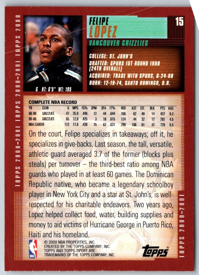This 2000 Topps Tipoff Felipe Lopez #15 Vancouver Grizzlies card is the perfect addition to any basketball card collection. Featuring an image of Lopez on the front, it captures the athleticism and energy of the star player in action. On the back, you'll find Lopez' stats from the 1999-2000 season, along with a brief bio. It's a must-have for fans of the Grizzlies, and a great addition to any basketball card collection.