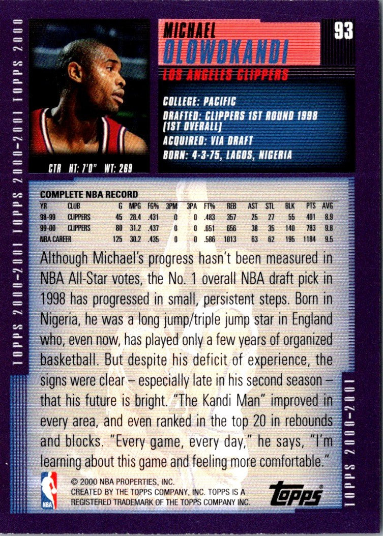 This 2000 Topps Tipoff Michael Olowokandi #93 Los Angeles Clippers card is a must-have for any Clippers fan or basketball card collector. Olowokandi was drafted first overall by the Clippers in 1998 and was the first-ever Nigerian-born player to be drafted in the NBA. This card is in perfect condition, with sharp edges and crisp colors. The card features Olowokandi in his iconic Clippers uniform and a great action shot of him in the middle of a jump shot. Add this piece of basketball history to your collection today and relive the excitement of the 1998 NBA Draft.