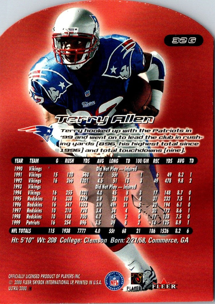 This 2000 Ultra Gold Medallion Terry Allen #32G New England Patriots trading card is a must-have for any serious collector! Featuring a glossy finish, this card shows off the best of Terry Allen's skills and talent in vivid detail. Each card is in near-mint condition and is sure to increase in value over time. Add this card to your collection today and show your support for this legendary Patriots player!