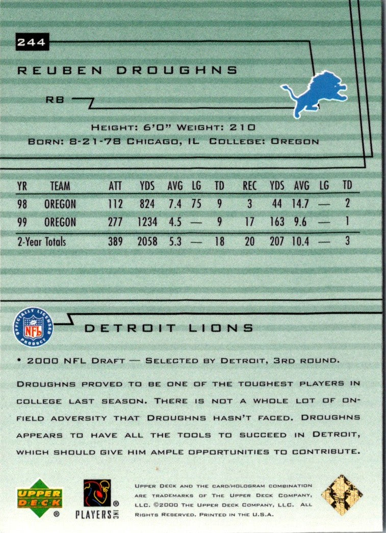 This 2000 Upper Deck Encore Reuben Droughns #244 Detroit Lions card is a fantastic addition to any football fan's collection. This card features a full-color action shot of Reuben in his signature Lions uniform, and the reverse side has a detailed biography and career highlights. With crisp edges and vibrant colors, this card is sure to stand out in your collection. Whether you're a die-hard Lions fan or just a fan of the NFL, this card is a must-have. Add it to your collection today!