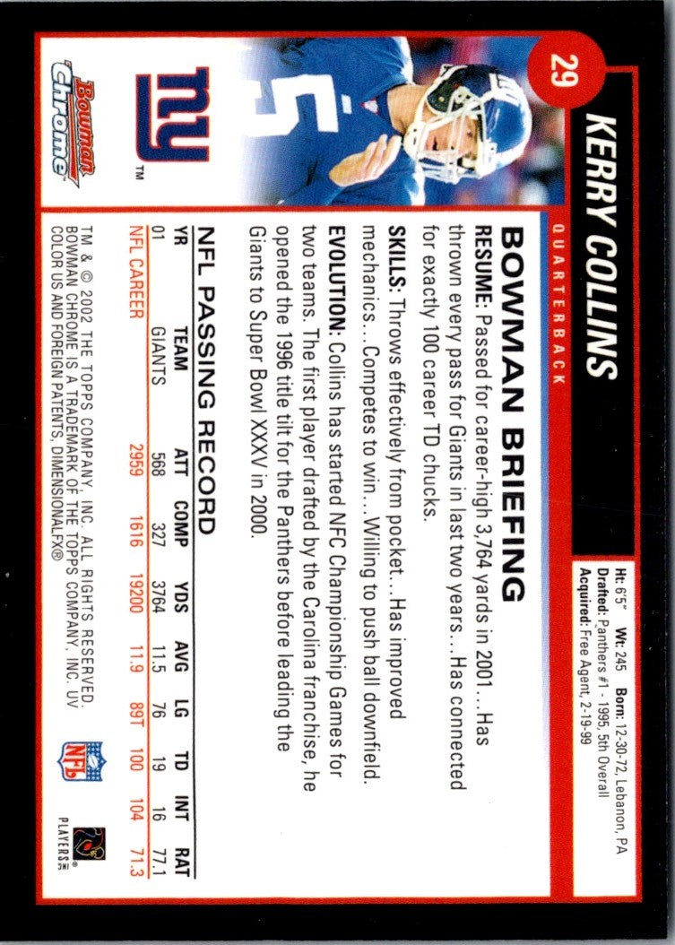 This 2002 Bowman Kerry Collins #29 New York Giants card is a great addition to any sports memorabilia collection. Featuring a bold and vibrant design, this card celebrates the success of the New York Giants and the accomplishments of Kerry Collins. It is a great way to show your support for the Giants and is sure to be a conversation starter amongst football fans. Add it to your collection today and commemorate the career of a Giants legend!
