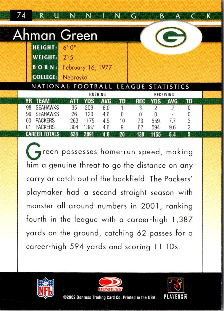 Ahman Green is a must-have card for any Packers fan! This 2002 Donruss card features an action shot of Green in his classic Packers uniform and highlights his stellar stats for the 2002 season. This card is a great addition to any sports collection and is sure to be a conversation starter for any fan. Ahman Green is an NFL legend and this card is a great way to show your admiration for the Packers and honor their history.