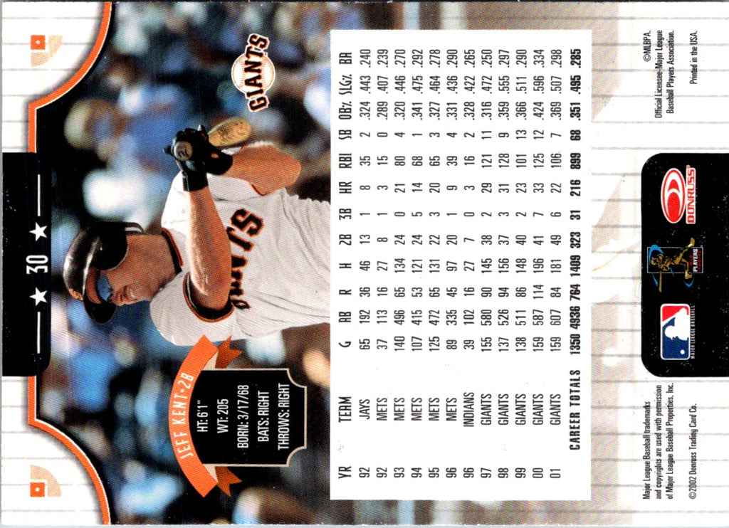 This 2002 Donruss Jeff Kent #30 trading card is a must-have for any San Francisco Giants fan! This card captures Jeff Kent in action as he was a key member of the San Francisco Giants during the 2002 season. It is printed on glossy card stock and features a full-color image of him in his Giants uniform. This card is a great way to commemorate his memorable season with the Giants and would make a great addition to any fan's collection!