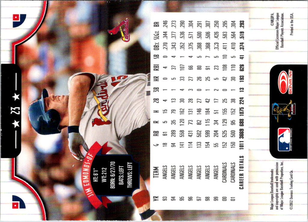 This 2002 Donruss Jim Edmonds #23 St. Louis Cardinals card is a great addition to any baseball collection. Featuring an action shot of Edmonds as he rounds the bases, this card captures the speed and agility of one of the most dynamic players of his era. It also features Edmonds' career stats and achievements, making it a great way to commemorate his illustrious career. Add this card to your collection today and pay homage to one of the greatest players of all time.