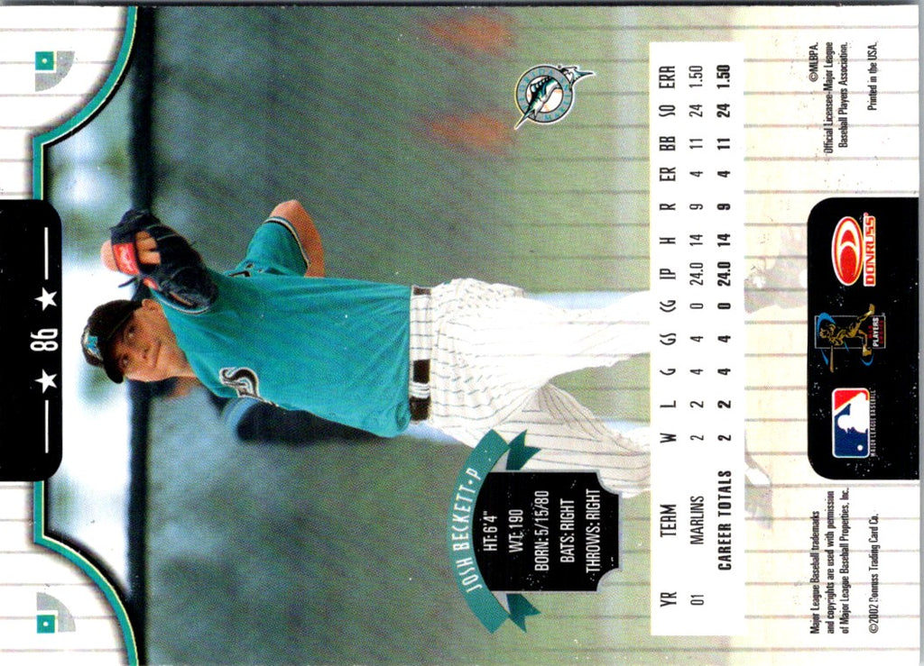 This 2002 Donruss Josh Beckett #86 card commemorates the Florida Marlins star pitcher. Beckett was drafted by the Marlins in 1999 and made his major league debut in 2001. In 2002, Beckett posted an impressive 13-9 record with a 3.04 ERA and 163 strikeouts. This card captures Beckett in mid-delivery, showcasing his powerful pitching style. Add this card to your collection today to honor this former Marlins ace!