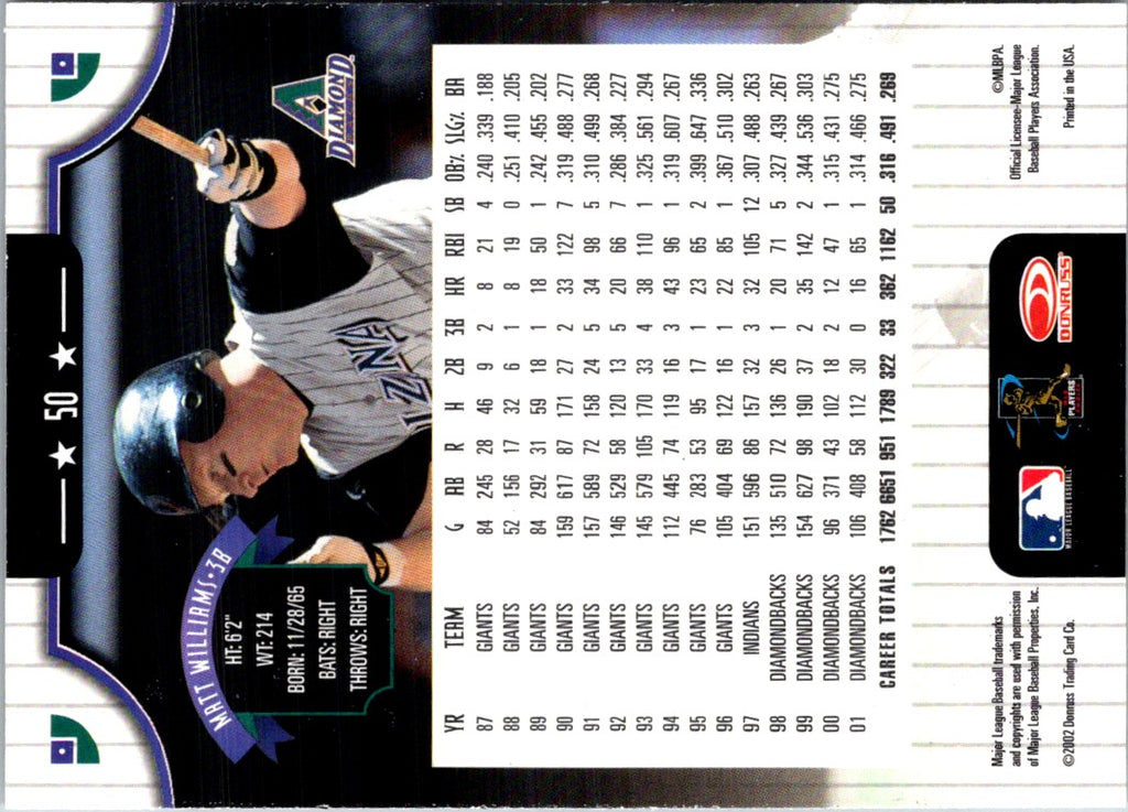 This 2002 Donruss Matt Williams #50 Arizona Diamondbacks baseball card is the perfect addition to your collection! Featuring a classic baseball pose with a vintage Diamondbacks uniform, this card is sure to be a talking point. It is also a great gift for any Diamondbacks fan! With its glossy finish and high-quality printing, this card is sure to stand the test of time. Add an iconic piece of baseball history to your collection today!