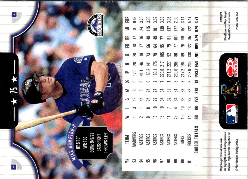 This 2002 Donruss Mike Hampton #75 is a must-have for any Colorado Rockies fan! This card features Hampton in his pinstripe Rockies jersey during his time with the team. The front of the card shows Hampton in action, while the back of the card gives a brief biography of his career. This card is a great way to commemorate Hampton's time with the Rockies and is a great addition to any collection.