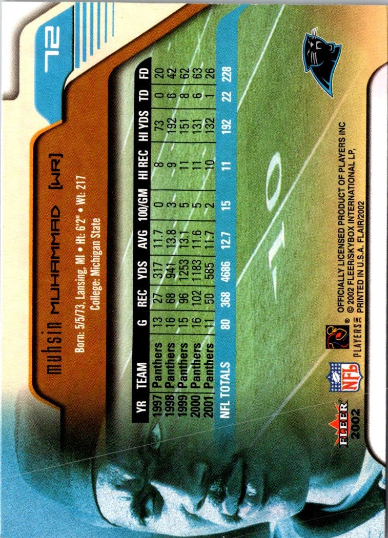 The 2002 Flair Muhsin Muhammad #72 Carolina Panthers is a must-have for all Panthers fans. It features a replica of the jersey worn by Muhammad during the 2002 season. This jersey is made of 100% polyester mesh and has a tackle twill name and number. It includes the Panthers logo and colors and is perfect for showing your support for your favorite team. Whether you're cheering on the Panthers from the stands or at home, this jersey is sure to make a statement.