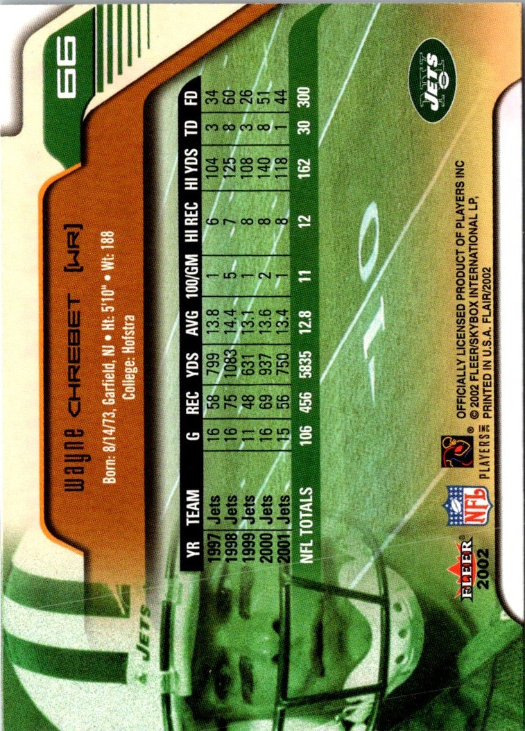 This 2002 Flair Wayne Chrebet #66 New York Jets card is the perfect addition to any Jets fan's collection. Featuring a classic action shot of Wayne Chrebet in his Jets jersey, this card is sure to be the envy of all of your friends. This card is a must-have for any Jets fan, as well as any collector of football cards. Don't miss your chance to add this classic card to your collection today!