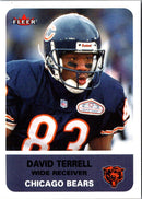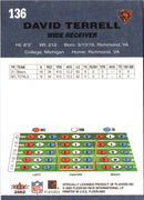 This 2002 Fleer David Terrell #136 card features the wide receiver in his Chicago Bears uniform. Terrell was the Bears first round draft pick in 2001 and had two 1,000 yard seasons in his 4 year career with the team. This card is a perfect addition to any Bears or football fan's collection. It features a full-color image of Terrell in action and is printed on high-quality card stock. Get this piece of sports history today!