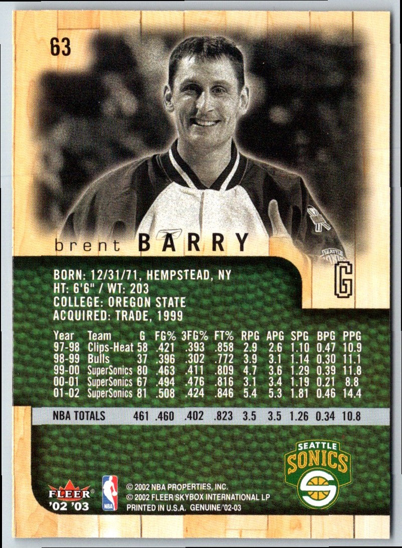 This 2002 Fleer Genuine Brent Barry #63 Seattle SuperSonics card is a great addition to any basketball card collection. The card features a full color photo of Barry in action with his team colors, with the Seattle SuperSonics logo in the upper right corner. The back of the card features a detailed profile of Barry, including his height, weight, birthplace, draft year, and bio. This card is perfect for any SuperSonics fan or collector of Barry memorabilia. Add it to your collection today!