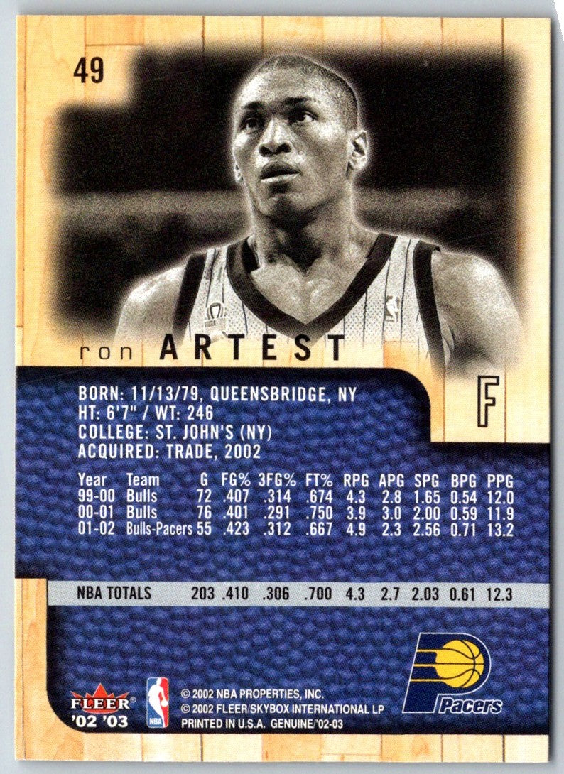 This 2002 Fleer Genuine Ron Artest card is a must-have for any Indiana Pacers fan! This card is in excellent condition and features a full-color photo of Artest in his Pacers uniform. It's a great way to show off you're a true Pacers fan! Add this card to your collection today and show your support for the Pacers!