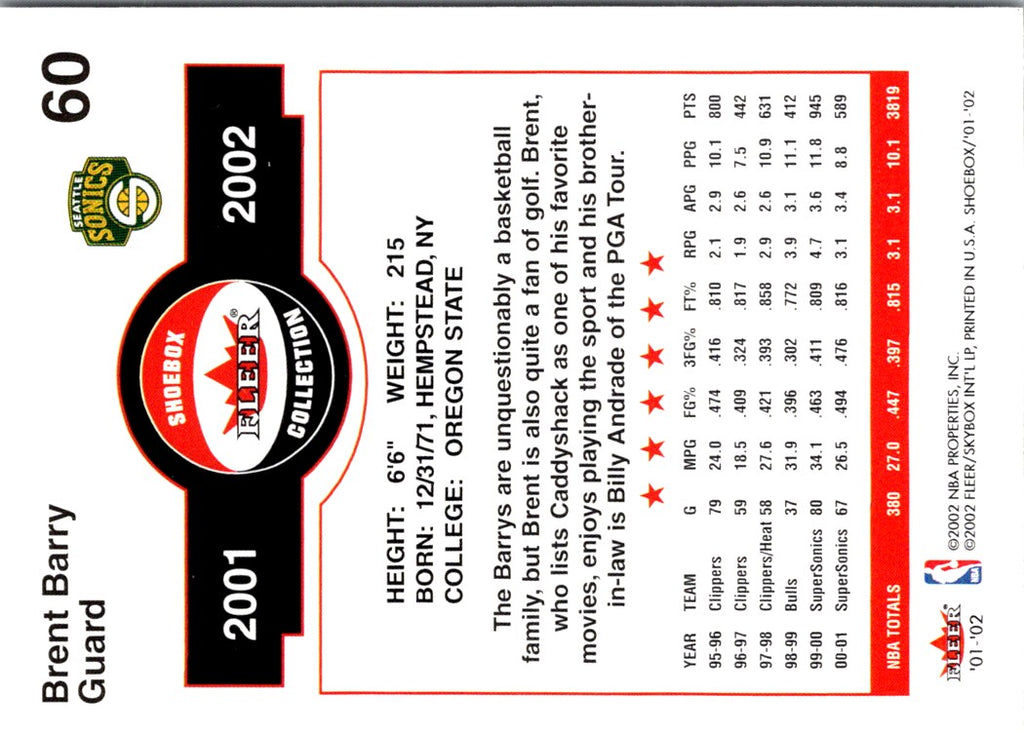 This 2002 Fleer Platinum Brent Barry #60 Seattle SuperSonics card is a must-have for any basketball fan! The card celebrates the career of one of the NBA's most unforgettable players. His signature leaping style and amazing court vision made him a fan favorite and helped him win an NBA Championship with the San Antonio Spurs in 2005. This card features a high-quality image of Barry in action, and it's a great way to honor his career. Add this card to your collection today to commemorate the legacy of Brent Barry!
