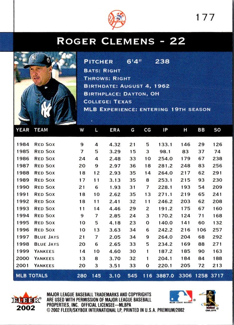 This 2002 Fleer Premium Roger Clemens #177New York Yankees trading card is an absolute must-have for any Yankees fan or collector. Featuring a classic image of Roger Clemens in full Yankees regalia, this card perfectly captures the intensity and power of "The Rocket" as he prepared to dominate the pitching mound. With its vibrant colors and sharp details, this card is sure to become a prized addition to any collection. Don't miss your chance to own a piece of baseball history. Get your 2002 Fleer Premium Roger Clemens #177New York Yankees card today!