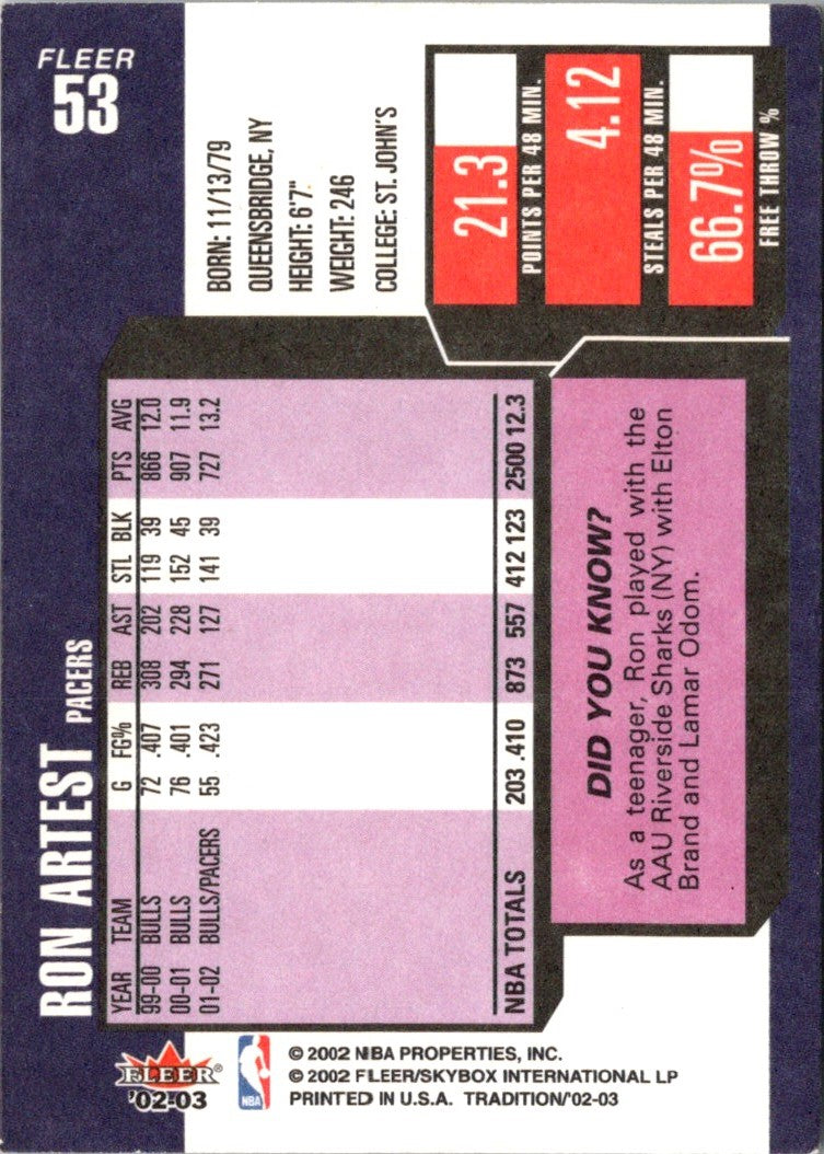 Description: 2002 Fleer Tradition Ron Artest #53