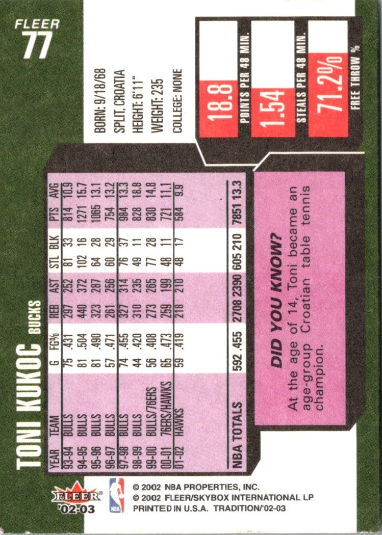 Description: 2002 Fleer Tradition Toni Kukoc #77