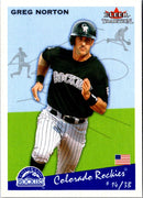 This 2002 Fleer Tradition Update card of Colorado Rockies Greg Norton features the player in his iconic Rockies uniform, ready to take the field. The card is in pristine condition, with sharp corners and a glossy finish. Norton is a switch-hitting outfielder who was a key part of the Rockies in the early 2000s. He hit .288 with 5 homers and 33 RBIs in the 2002 season. A great addition for any Rockies fan or baseball card collector.