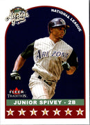 This 2002 Fleer Tradition Update card features Junior Spivey of the Arizona Diamondbacks. Spivey, a second baseman, played for the Diamondbacks from 2001 to 2004, helping the team to its first World Series Championship in 2001. This card features a detailed action shot of Spivey in his Diamondbacks uniform, with the team's logo on the front. It is the perfect addition to any Diamondbacks fan's collection, and a great way to commemorate Spivey's time with the team.