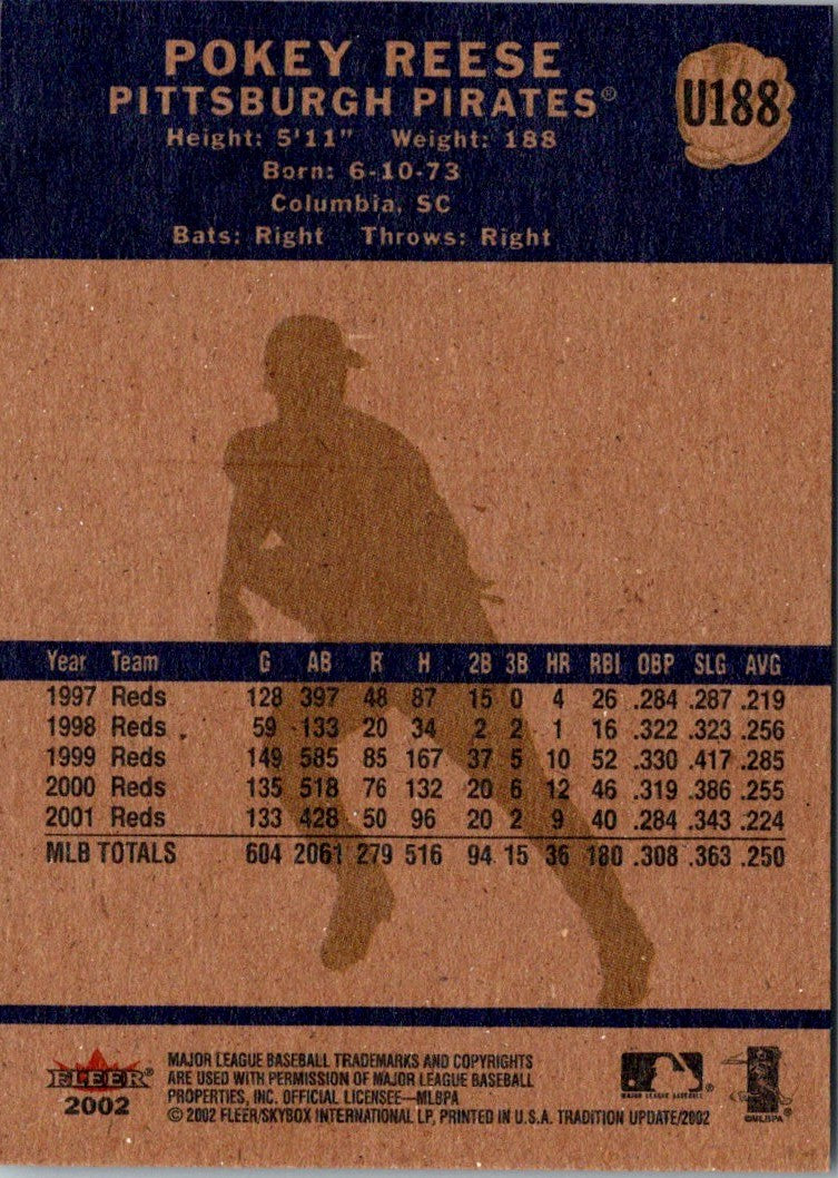 This 2002 Fleer Tradition Update Pokey Reese card #U188 is a must-have for any Pittsburgh Pirates fan! Featuring a sharp, detailed image of the versatile infielder in action, this card celebrates his contributions to the team. This card is perfect for the collector looking to add a unique item to their memorabilia collection. Add this card to your collection today and honor the career of a true Pirates great!