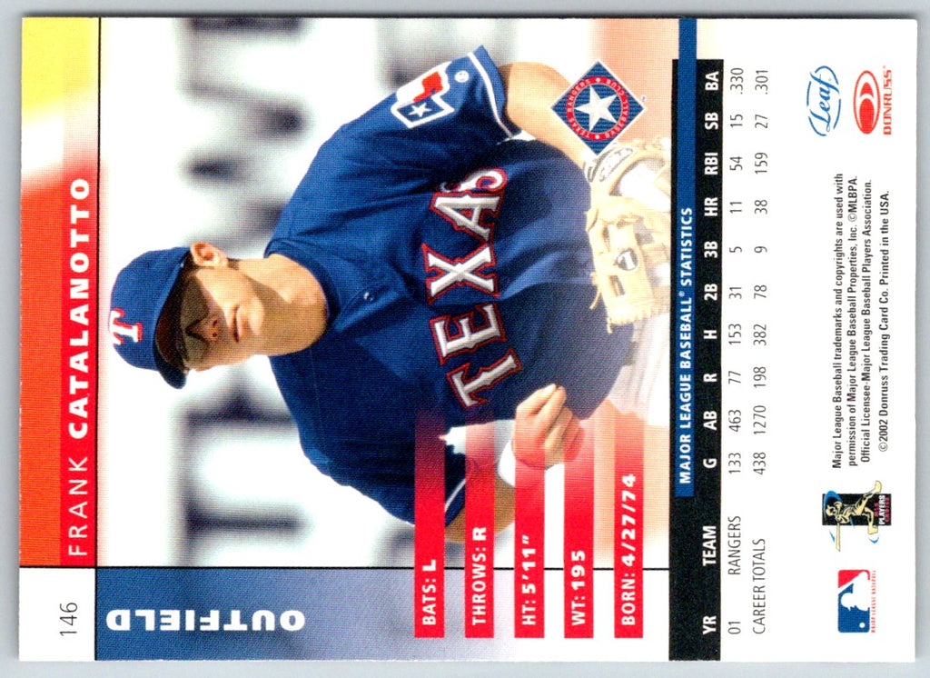This 2002 Leaf Frank Catalanotto #146Texas Rangers card is a must-have for any serious fan of the Rangers. Featuring a high-quality image of Catalanotto in his Texas uniform, this card is an ideal way to commemorate his time on the team. With the sharp colors and crisp details, this card is sure to look great on display. Add this card to your collection and celebrate the career of one of the most beloved Rangers players.