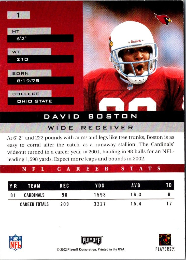 This 2002 Playoff Honors David Boston #1 Arizona Cardinals card is a great addition to any collection. Boasting bold colors and crisp detail, this card features Boston in an iconic pose that will make any fan nostalgic. The card shows off Boston's impressive stats, from his 1,598 receiving yards in 2001 to his 7 touchdown catches, making it a must-have for any Cardinals fan. With this card, you can celebrate the career of one of the most iconic players in the history of the Arizona Cardinals. Add it to your collection today!
