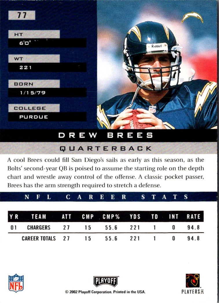 2002 Playoff Honors Drew Brees #77 San Diego Chargers is the perfect piece of memorabilia for any Chargers fan. This card features an action shot of Brees in his San Diego uniform on the field of play. Showcasing a glossy finish and vibrant colors, this card is sure to be the highlight of any collection. A great reminder of the great quarterback's time with the Chargers, this card is sure to become a treasured item. Get your hands on this unique piece of Chargers history today!