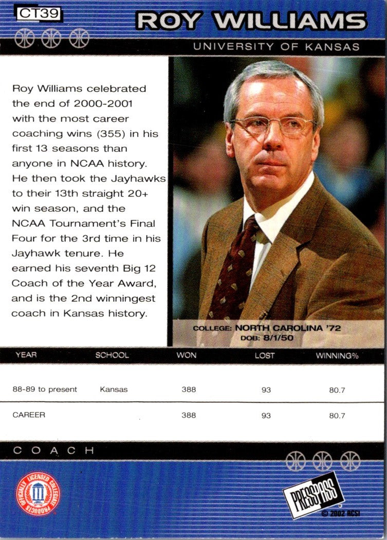 This 2002 Press Pass Roy Williams card #T39 from the Kansas Jayhawks is a must-have for any fan of the NCAA or basketball! Featuring legendary player Roy Williams, this card pays homage to one of the most successful and beloved college basketball coaches in history. This card also captures the essence of the Kansas Jayhawks, as the team had a long history of success under Williams' leadership. Add this card to your collection today and show off your support for the Kansas Jayhawks!