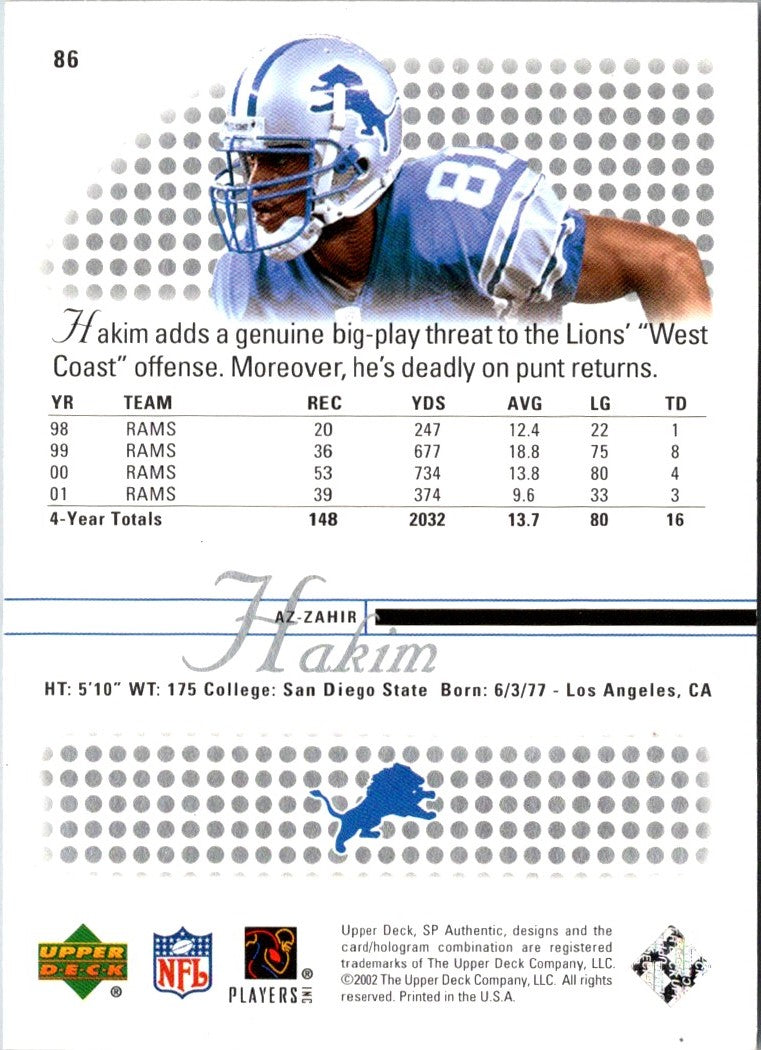 From his 2002 SP Authentic rookie card, Az-Zahir Hakim was one of the most electrifying wide receivers in the NFL. Show off your football card collection with this 2002 SP Authentic card of the Detroit Lions' Az-Zahir Hakim. The perfect addition to any NFL fan's collection, this card features a crisp image of Hakim in action, with detailed statistics and team logos. You won't want to miss out on this must-have collectible. Add Az-Zahir Hakim to your collection today!