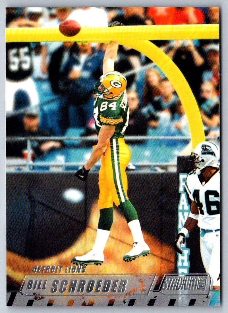 The 2002 Stadium Club Bill Schroeder #76 Detroit Lions card is a must-have for any Lions fan. This card features a full-color shot of Schroeder in his Lions uniform, with a crisp and clear action shot of the star wide receiver in mid-stride. This card is made from high-quality materials, ensuring that it will last for years to come. It makes a great addition to any collection and a great gift for any Lions fan. Get your hands on this classic card today and make sure you don't miss out!