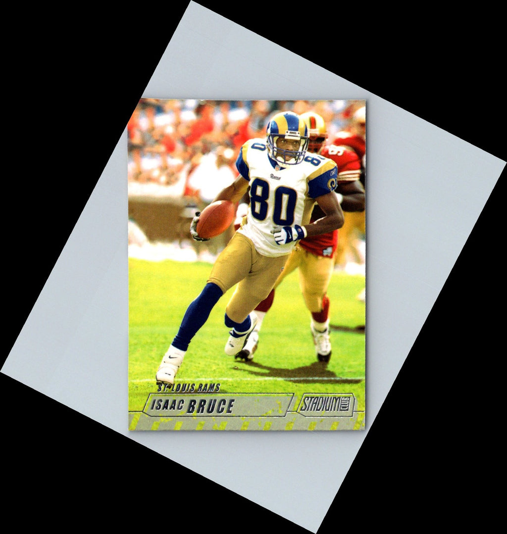 The 2002 Stadium Club Isaac Bruce #64 St. Louis Rams card is a must-have for any Rams fan or sports card collector. It features a classic image of Bruce in his iconic Rams uniform, along with an up-close shot of his face on the back. The card is printed on high-quality card stock, ensuring it will last for years to come. With a bright, bold design, it is sure to stand out in any collection. Add this piece of Rams history to your own collection today and celebrate the career of one of the franchise's greatest players.