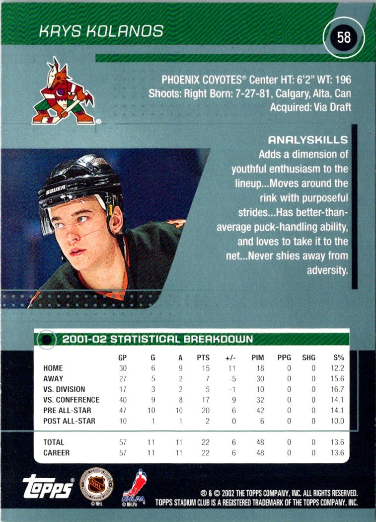 This 2002 Stadium Club Krystofer Kolanos #58 Phoenix Coyotes card is a great choice for any hockey fan. Showcasing an incredible full-color image of Kolanos, this card is sure to make a great addition to any collection. The Stadium Club brand has long been a favorite of hockey card collectors, and this card features great detail and vibrant colors. Suitable for any collector, this card is sure to be a hit with any hockey fan!